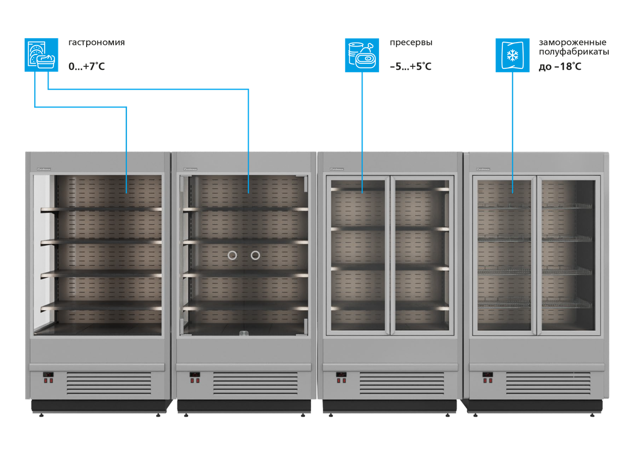 Модельный ряд представлен открытыми модулями, а также закрытыми: фронт X0 (низкоэмиссионное стекло); фронт X5 (энергосберегающий стеклопакет с подогревом рамы двери); фронт X5L (двухкамерный стеклопакет с подогревом рамы двери и стеклопакета).