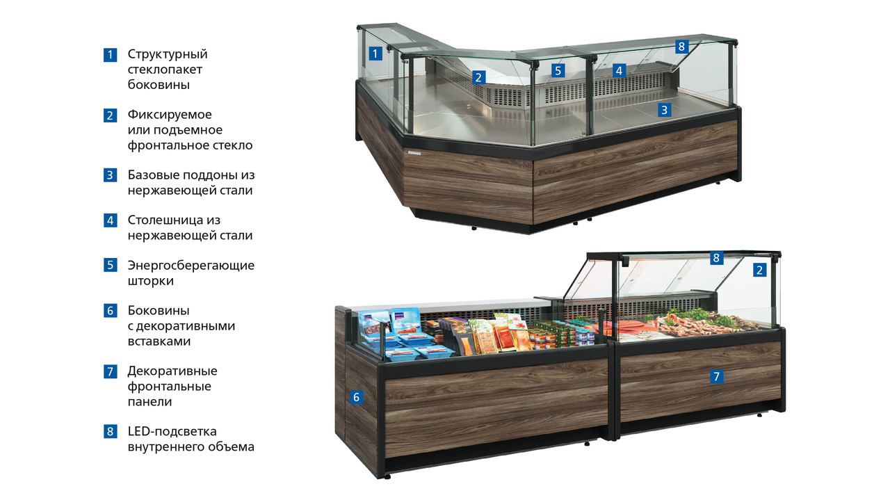 Гастрономические витрины BAVARIA 3 предназначены для мяса, сыра, рыбы, молочных продуктов, пресервов, замороженных полуфабрикатов, кондитерских изделий, выпечки.