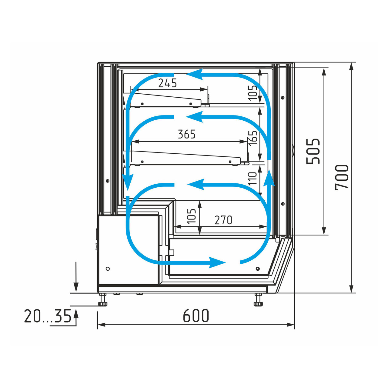 Глубина выкладки, мм: 270 (2 полки 245, 365 мм)