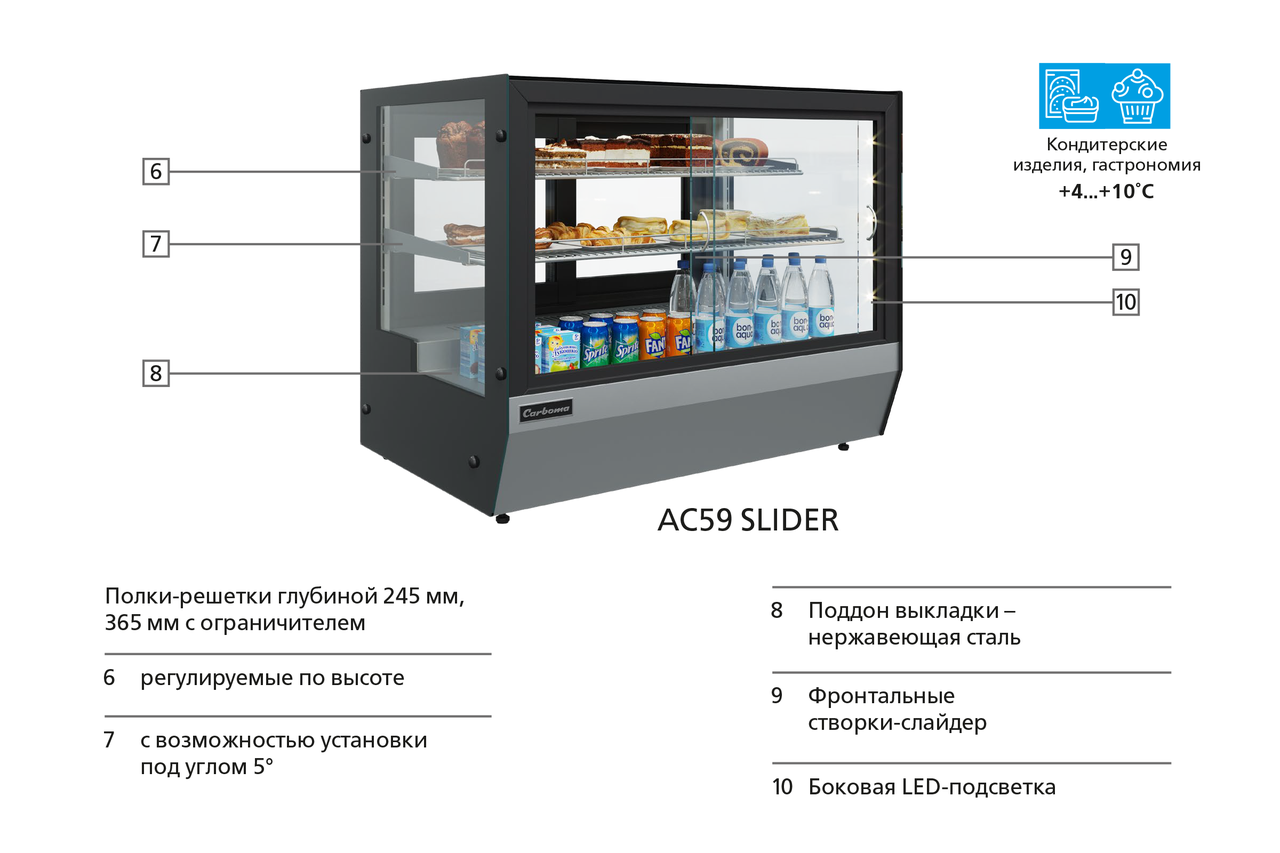 Компактная и мобильная витрина AС59 SLIDER идеальна для небольших кафе, баров с большой проходимостью, когда требуется снизить нагрузку обслуживающего персонала. Витрина оснащена раздвижными створками-слайдерами с двух сторон — со стороны покупателя для самообслуживания и со стороны продавца — для удобства загрузки товара.