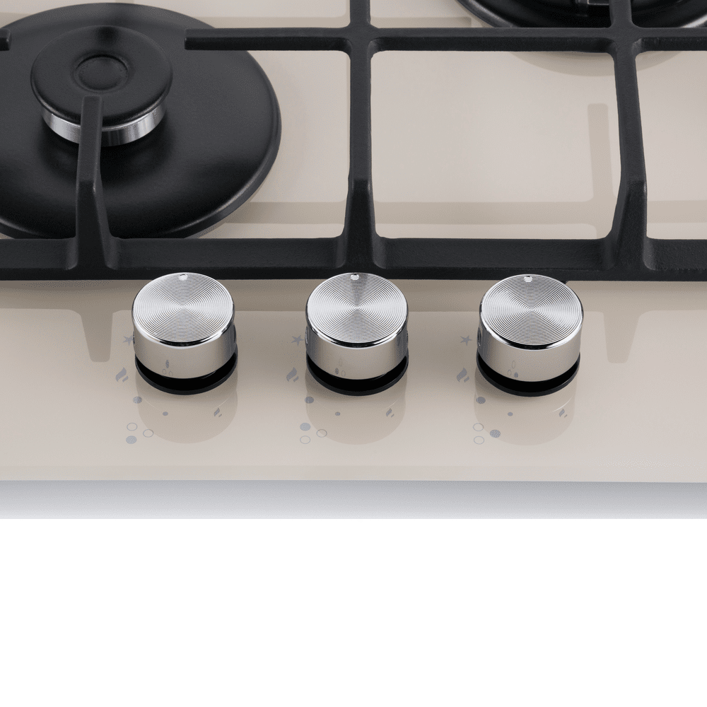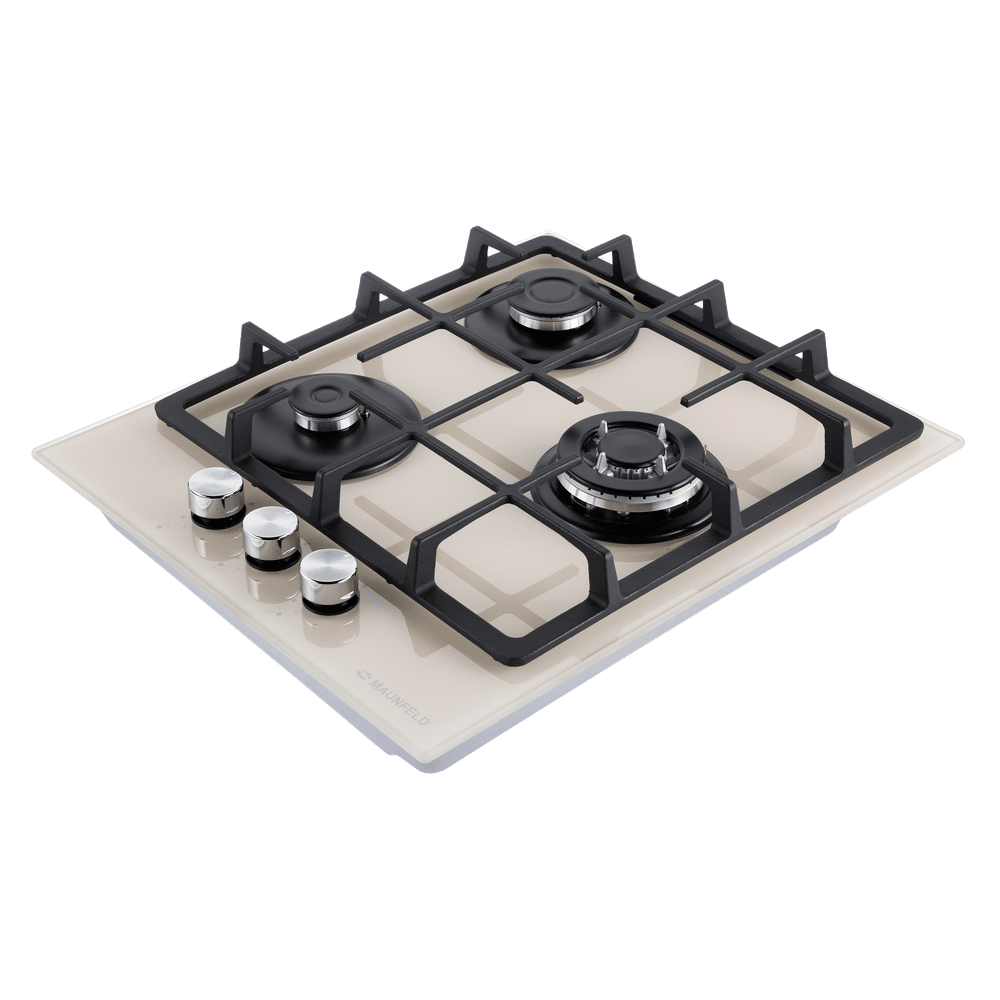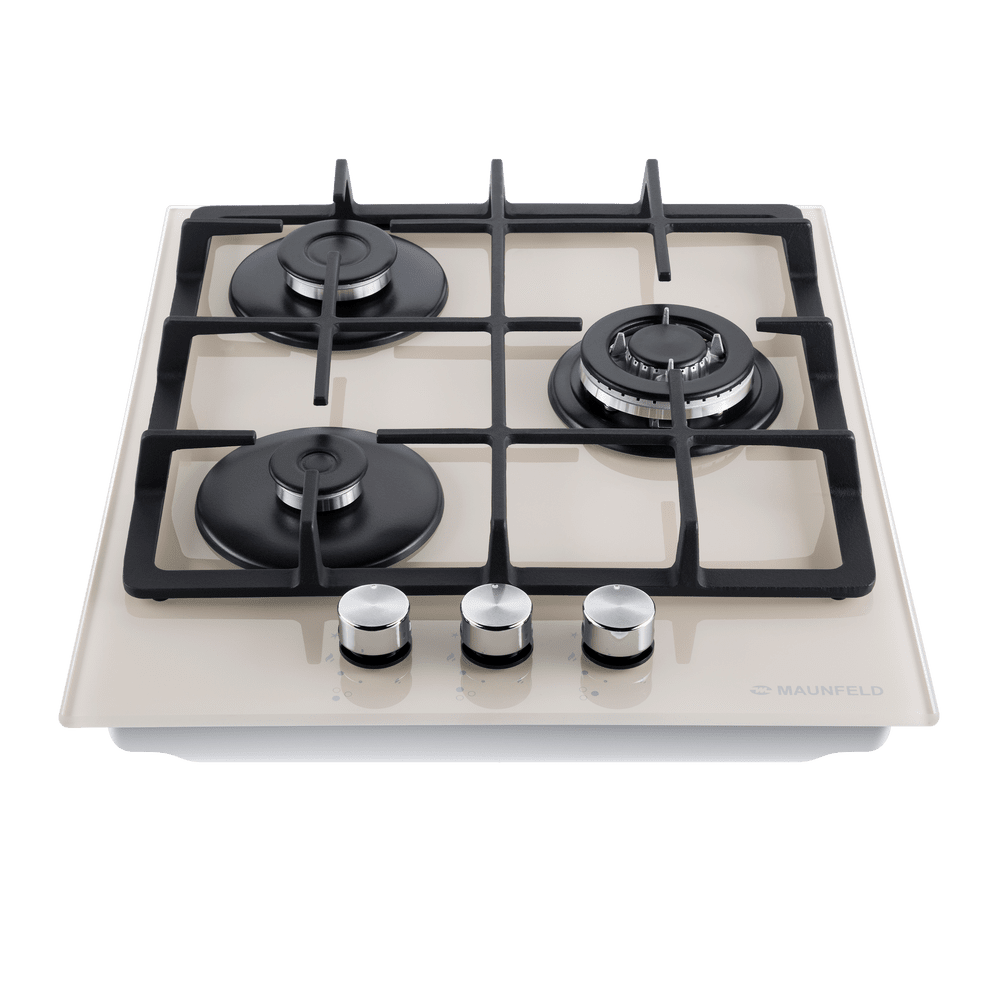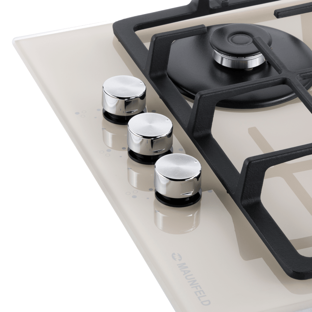 Встраиваемая трехконфорочная газовая варочная панель MAUNFELD EGHG.43.33CBG/G выполненаиз закаленного стекла бежевого цвета с чугунной решеткой. Благодаря своей массивности, решетки обладают устойчивостью, не скользят под посудой, не гнутся под весом кастрюль. Варочная панель с механическим управлением с помощью ручек из высокопрочного термостойкого пластика.